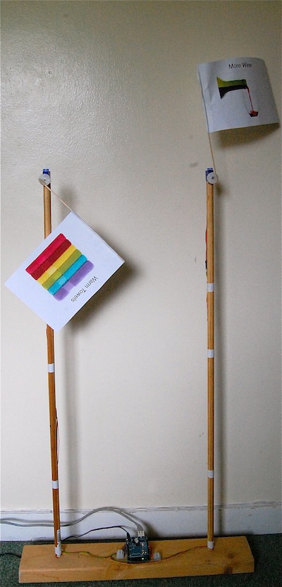 I decided to try out Handbag to control a couple of servos that raise little paper flags in a project I developed for my book 'Arduino + Android Projects for the Evil Genius'. In the book, the servos were attached to an Arduino / Ethernet shield combination. In this case, I decided to attach them to a USBDroid board, although an Uno and USB host shield would work just as well.